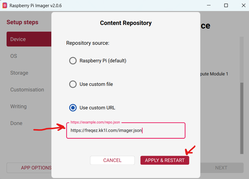 A complete FreqEZ Controller software installation can be created using the Raspberry Pi organization’s Imager program ( https://www.raspberrypi.com/software/ ) to burn this image file to a microSD card. The resulting microSD will contain both the Raspbian operating system and pre-configured FreqEZ RPi software. When finished, just insert the microSD card into the RPI and apply power. Step-by-step instructions can be found below and in the “Raspberry Pi Controller – Preparing the microSD Card” section of the documentation by clicking on Help in the v2.2.0 Windows Console or opening the on-line Help file in >Downloads >Version 2.2.0 “FreqEZhelp.dbf”.