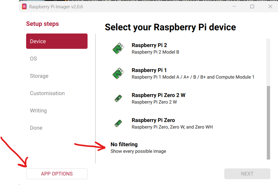 (or select and press NEXT) - Choose the storage device (microSD) to write